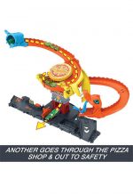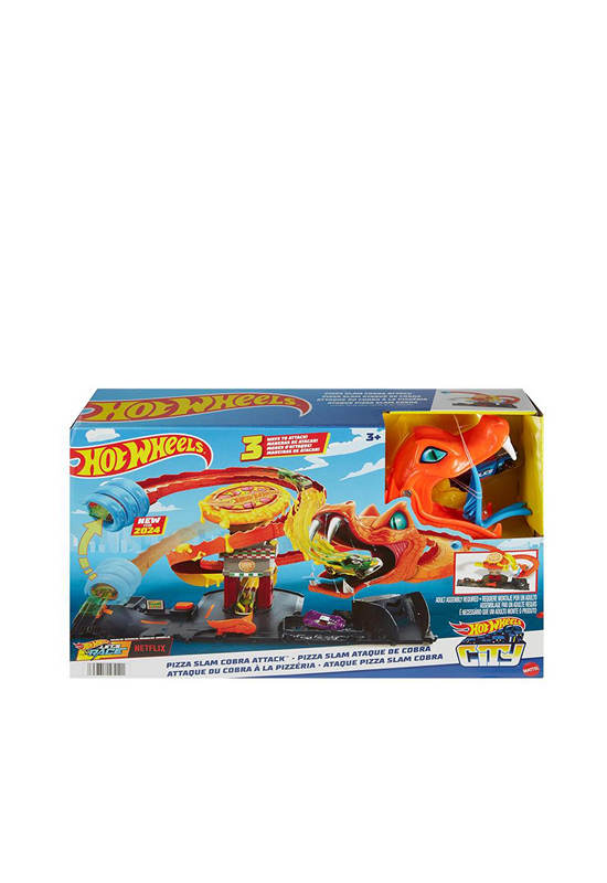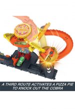 Take on a hungry cobra that has slithered into the pizza shop and save Hot Wheels City just like in the Netflix series «Let’s Race»! Drive into the cobra’s tail and release it to see which of three random paths the car will take. Will it race through the cobra’s mouth and end up in the dumpster? Maybe it will have the unfortunate ride that ends in the creature’s mouth. Or maybe it will send a pizza pie smack into the cobra’s face, defeating it! The set features cool track play details to inspire storytelling adventures and can connect to other Hot Wheels City sets for open-ended play. Each sold separately. One Hot Wheels car is included.
