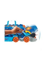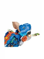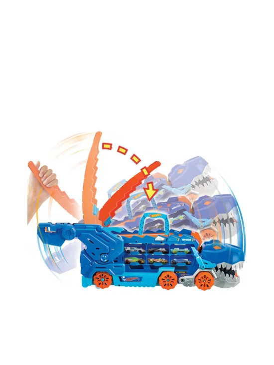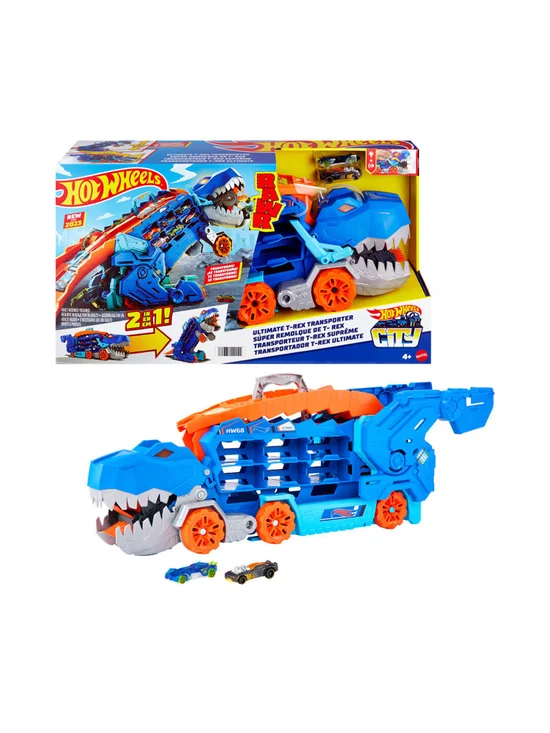 The Hot Wheels City Ultimate Hauler can gobble up and haul more than 20 1:64 scale cars and then transform into a growling, stomping T-Rex with a race track on its back! In hauler mode, pull it by the handle and watch it eat the 1:64 scale cars in its path. Lower the tail and it transforms into a Robo T-Rex with lights and sounds and a two-lane race track. Kids can also launch cars from its mouth! Two 1:64 scale Hot Wheels cars are included. Colors and decorations may vary from the brand HOTWHEELS.