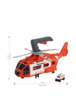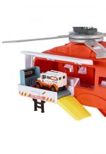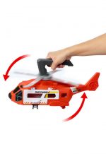 HOTWHEELS presents Fly the Matchbox Action Drivers Rescue Helicopter to the rescue! This large-scale, 16″ helicopter features a kid-powered propeller, working winch and transforms into a mission control for the ultimate rescue mission. Press the lever on the handle to activate the propeller and «fly» onto the scene. From the air, lower the winch and pick up a 1:64 scale die-cast car to carry it aboard, saving the day. After landing the helicopter, transform it into a mission control that features a car-activated GPS station. Includes a 1:64 scale die-cast ambulance for expanded storytelling, and kids can store up to 4 vehicles inside the helicopter.
