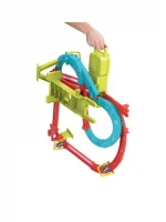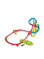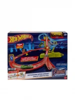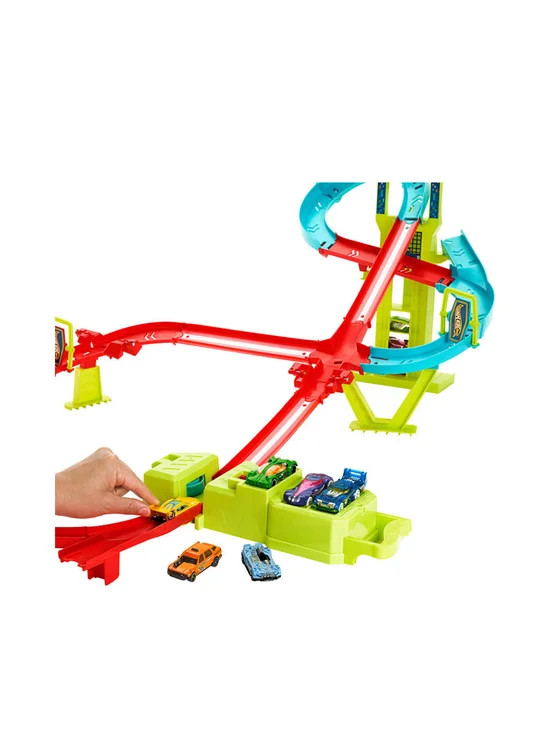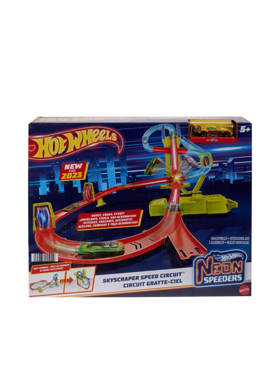 Race through a cool cityscape with the Hot Wheels Neon Speeders Skyscraper Speed Circuit Track Set. Kids load their Hot Wheels car into the motorized booster that launches vehicles along a track and weaves up and around a skyscraper. As vehicles speed through the track flippers, it creates an effect that looks as though lights are flickering on and off. The motorized booster keeps cars racing and adds more cars to increase the excitement and the potential for an epic crash. One Hot Wheels car is included and the set folds for convenient storage. Colors and decorations may vary from the brand HOTWHEELS.