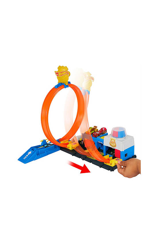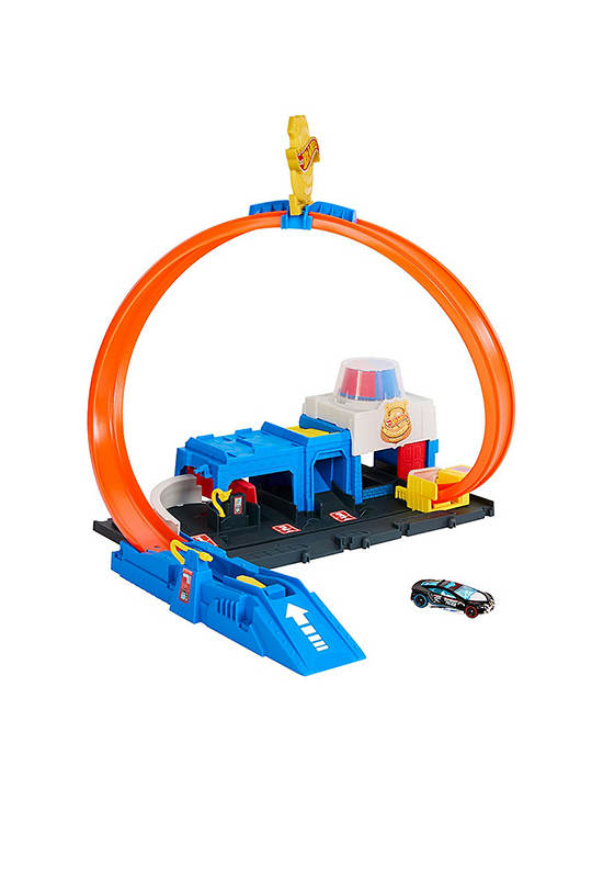 There are four different ways to race and stunt through the HOT WHEELS City Super Police Station playset with its adjustable track! Drive the included 1:64 scale die-cast toy police car into the launcher where there’s a flex hose to refuel before heading into action. Slide the loop-track to one of four paths each one showcases a different stunt or outcome. Park up to four vehicles on the set and attach other tracks and playsets for open-ended play. One car is included; additional vehicles and tracks sold separately. Colors and decorations may vary.