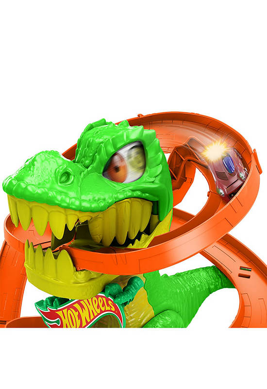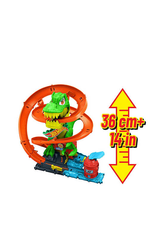 Use epic racing skills to protect HOT WHEELS City from a dynamic T-Rex that wants to eat all the cars! Kids launch the included 1:64 scale die-cast toy vehicle, and it zooms around the dino with three possible outcomes: get eaten and pooped out; hit a detour to refuel; or conquer the beast and save friends. Each time cars zoom past, the T-Rex’s eyes spin and arms shake until it finally collapses! There’s storage for additional cars and push-around play details for open-ended storytelling. Colors and decorations may vary.