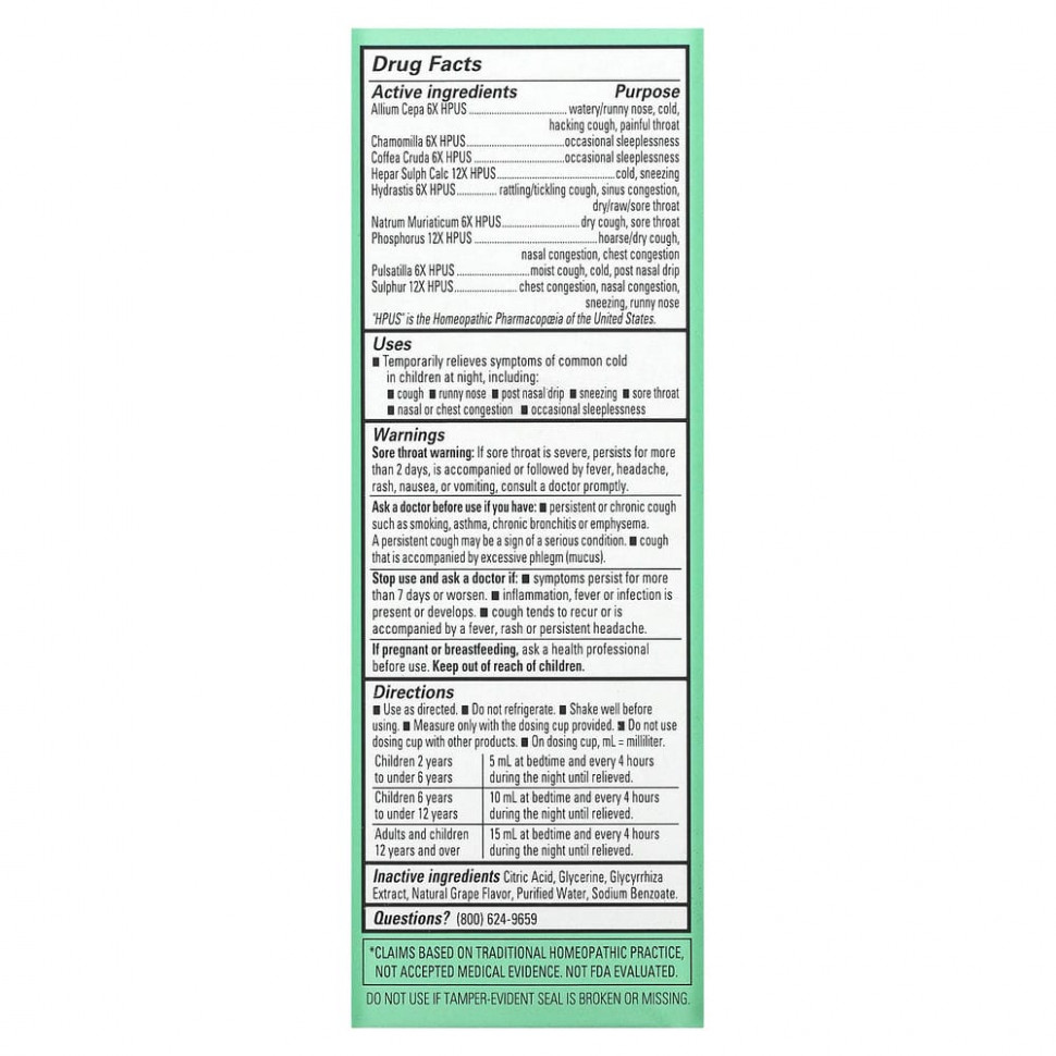 Ночной сироп от кашля и простуды для детей от Hyland’s 4 Kids облегчает общие симптомы простуды у детей, в том числе кашель, чихание, боль в горле, насморк, заложенность носа, накопление секрета в бронхах, помогает при эпизодической бессоннице.