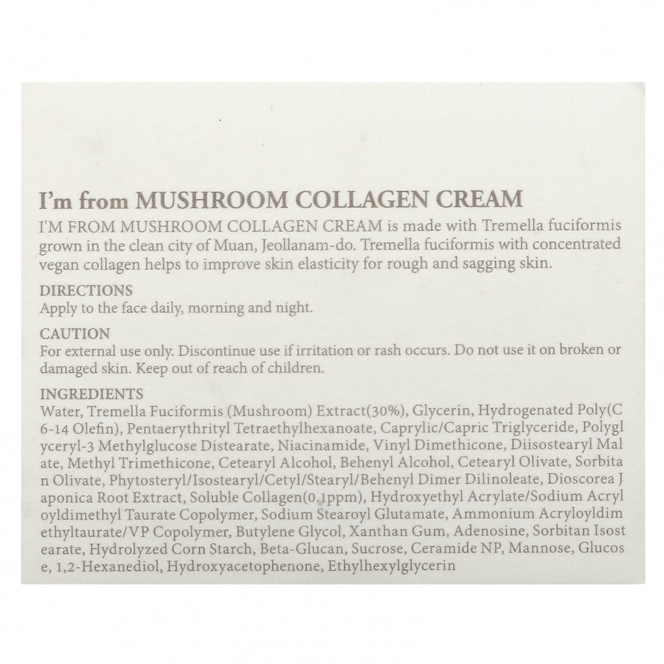 Крем I’M From Mushroom с коллагеном изготовлен из тремеллы фуциформной, выращенной в экологически чистом городе Муан, штат Чолла-Намдо.