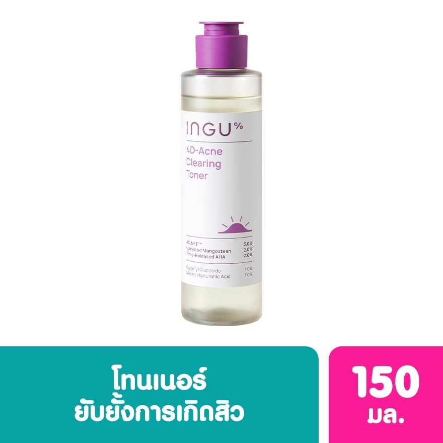 INGU 4D-Acne Clearing Toner. Gentle acne treatment toner With ingredients that can help stop all 4 mechanisms of acne on the face, including (1) the sebaceous glands producing too much oil. (2) Skin cells that accumulate and slowly exfoliate. Causes blockage. (3) Growth of bacteria that causes acne. (4) Inflammation of the skin from bacteria leads to acne. It contains extracts from mangosteen peels that help stop acne-causing C.Ance bacteria along with Time-Released AHA for superior cell exfoliation. and is gentle More than normal AHA acids, suitable for people with acne. Sensitive skin can use it.