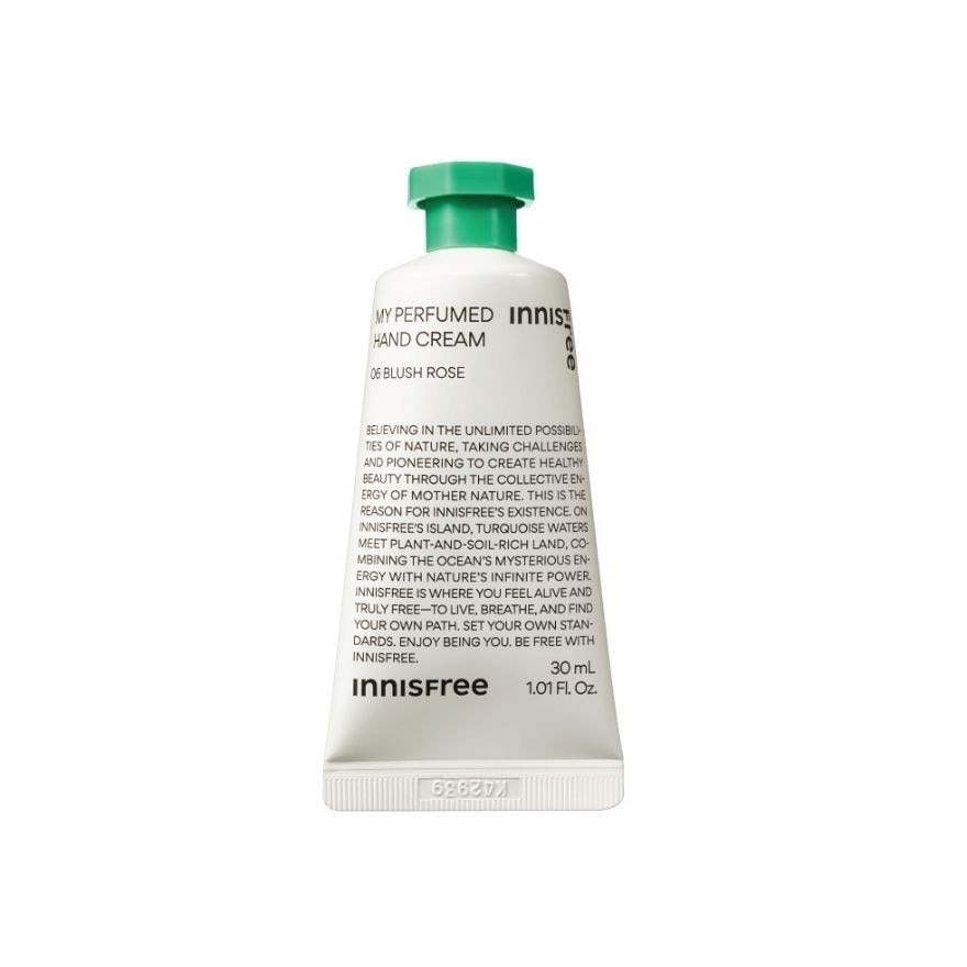Innisfree My Perfumed Hand Cream 06 Blush Rose A Scented hand cream that can be enjoyed every day, infused with the fragrance of fresh and sweet fruits, a true gift from Jeju’s warm sunlight and nature The formula containing plant-derived wax with the protection patch system applied keeps the fragrance and moisture for a long time. From fruity scents to innocent floral scents and calm musk scents, you can create a different atmosphere every day. 06 Blush Rose A thrilling rose scent from a bouquet of pink roses. A floral amber scent. How to use. After washing, apply desired amount onto hands.