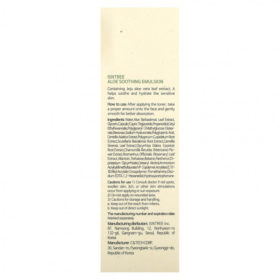 Эмульсия, содержащая экстракт листьев алоэ вера Чеджу, увлажняет и успокаивает кожу, создавая ощущение охлаждения.