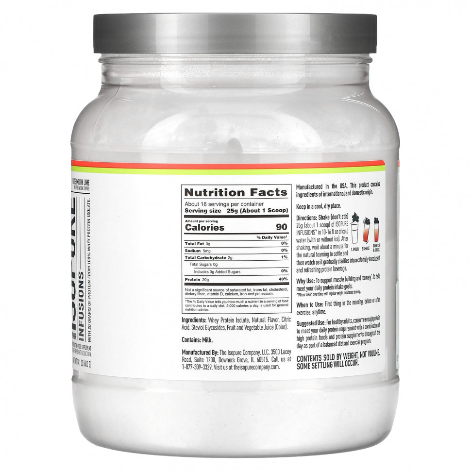 ISOPURE INFUSIONS ™ — это не обычный протеиновый порошок, похожий на молочный коктейль. Он имеет освежающий легкий фруктовый вкус и содержит необходимый белок без лишних ингредиентов. Хорошо встряхните ISOPURE INFUSIONS ™ и наблюдайте, как 20 граммов 100% изолята сывороточного протеина превращаются в ярко-прозрачный освежающий напиток прямо на ваших глазах. Вы получите только то, что заявлено: 5 ингредиентов, без жира и добавленного сахара**, всего 90 калорий** в 1 мерной ложке. Изготовлено из натуральных ароматизаторов арбуза и лайма и подслащено только экстрактом листьев стевии. Просто, эффективно и вкусно.