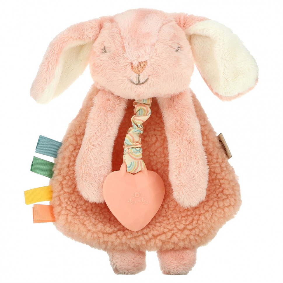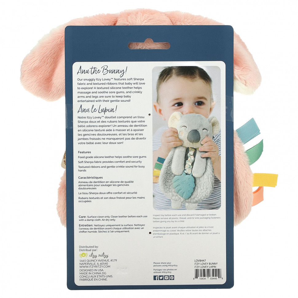 Наш уютный Itzy Lovey ™ изготовлен из мягкой шерпа-ткани и имеет фактурные ленты, которые понравятся малышам! Текстурированный силиконовый прорезыватель для зубов помогает массировать и успокаивает воспаленные десны, а морщинистые ручки и ножки обязательно будут развлекать ребенка своим нежным звуком!