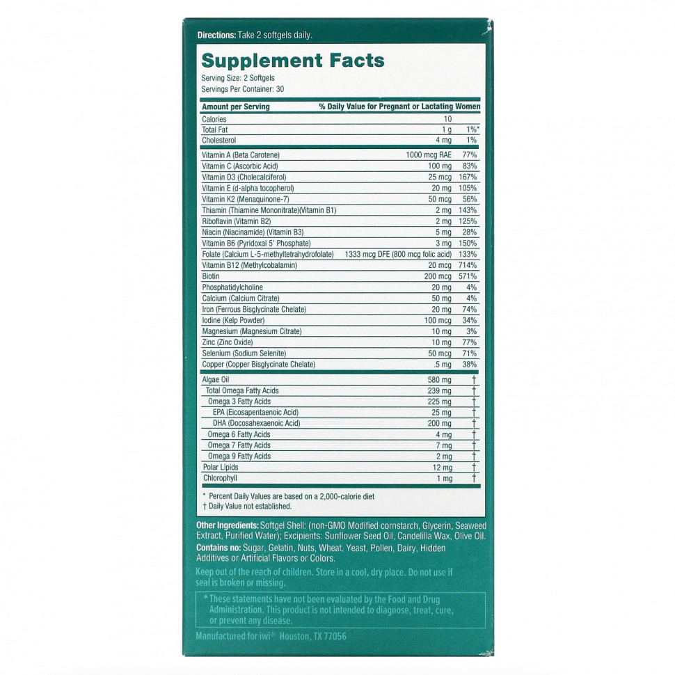 Здоровье вашего ребенка начинается с крошечного чудо природы: водорослей. Almega®PL, наша запатентованная форма водорослей Омега-3, обладает множеством преимуществ и абсорбируется на 50% лучше, чем рыбий жир или масло криля. Эта пренатальная добавка содержит DHA, ключевое питательное вещество для роста глаз и мозга вашего ребенка. Для еще большей поддержки мы добавили метилфолат и витамин D3 для когнитивных способностей ребенка и развития костей, а также железо и K2 для вашего здоровья во время беременности. Используя силу иви, вы улучшите питание для себя и своего ребенка. Питайте то, что внутри, потому что лучшая жизнь начинается внутри.