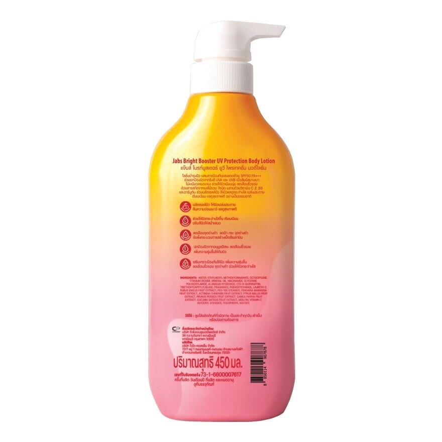 Jabs Bright Booster UV Protection Body Lotion SPF50 PA+++ Skin care lotion with SPF50 PA+++ Helps protect the skin from UVA and UVB rays, light texture. not sticky with fruit extracts Combined with vitamins C, E, B3 and Arbutin to help exfoliate skin cells. make the skin look radiant Shine, smooth, look healthy naturally. Helps to smooth and soften the skin. reduce wrinkles — radiant formula suitable for all skin types — Mix SPF50 PA+++ Helps protect skin from UVA and UVB rays. — Light texture. not sticky — Helps exfoliate skin cells Make the skin look radiant, glowing, smooth.