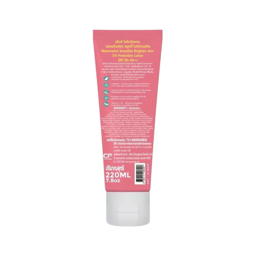 Jabs Sunscreen Lotion Watermelon Smoothie Brighten Skin Lotion SPF 50+ PA+++ Skin care mixed with hybrid sunscreen. Protects the skin from UVA and UVB rays. Helps restore the skin from UV, IA and Blue Line. Prevents wrinkles from the sun. Combines 8 types of hyaluronic substances Watermelon extract and lingostem revitalize dry, flaking skin to be moisturized, smooth, and replenish water to the skin for a long time. — Watermelon extract Make the skin full of water Helps fight free radicals Protects the skin from water loss during the day. — Lingostem, an innovative stem cell that protects the skin from UV, IR, Blue light, reduces wrinkles caused by sunlight. — Capparis spinosa, wild watermelon extract, balances the skin and restores damaged skin. Dry, flaky skin is said to be moisturized and full. — 8 types of hyaluronic acid retain moisture and replenish water to the skin. Deep wrinkles appear shallower. — Vitamin E / B3 protects the skin from free radicals. Reduce wrinkles and helps brighten the skin.