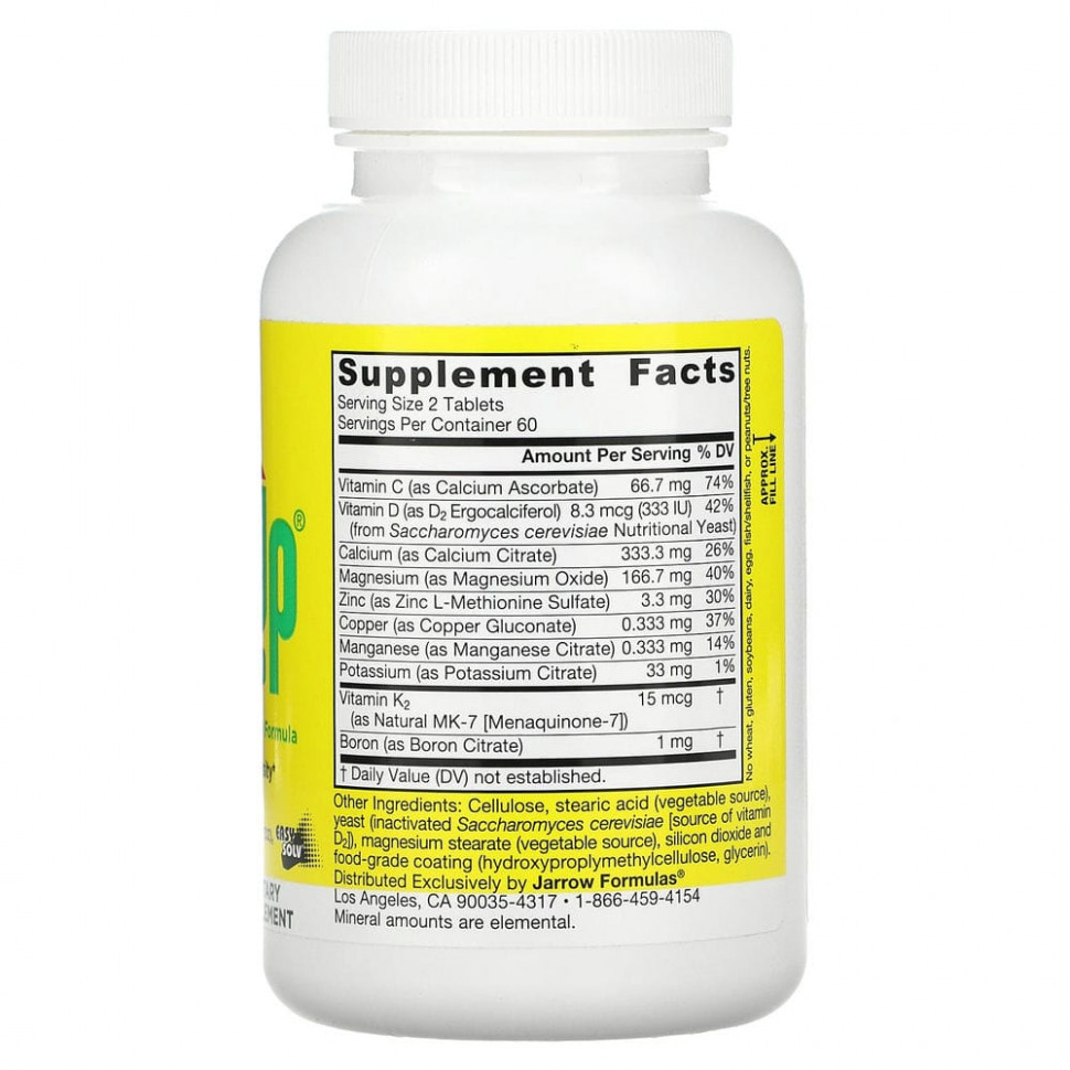 Вегетарианская и веганская добавка BoneUp® содержит цитрат кальция, вегетарианский и веганский источник необходимого минерала — кальция в форме, которая отличается превосходным усвоением. Кроме того, вегетарианская и веганская добавка BoneUp® содержит витамин K2 (в форме витамина К с повышенной биодоступностью, MK-7, полученной в результате естественного процесса ферментации) и витамин D2, поддерживающий отложение кальция в костях и способствующий формированию органического матрикса костей. Добавленный в состав цитрат калия обеспечивает оптимальную поддержку костной системы.
