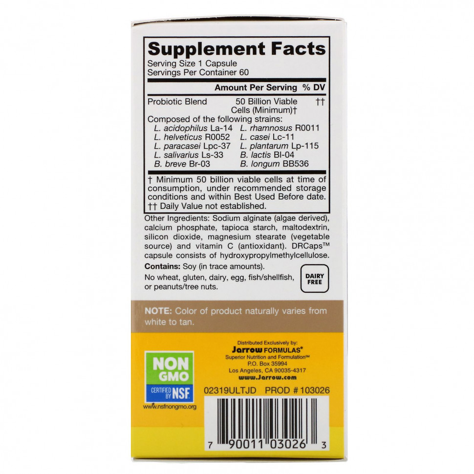 Максимальная выживаемость живых пробиотических организмов при прохождении через желудок и кишечник стала возможной благодаря уникальной системе доставки Jarro-Dophilus Ultra, состоящей из вегетарианской кислотоустойчивой капсулы и интеграции пробиотиков с гелеобразующей матрицей для защиты от негативных воздействий. эффекты желудочного сока и пищеварительных жидкостей.