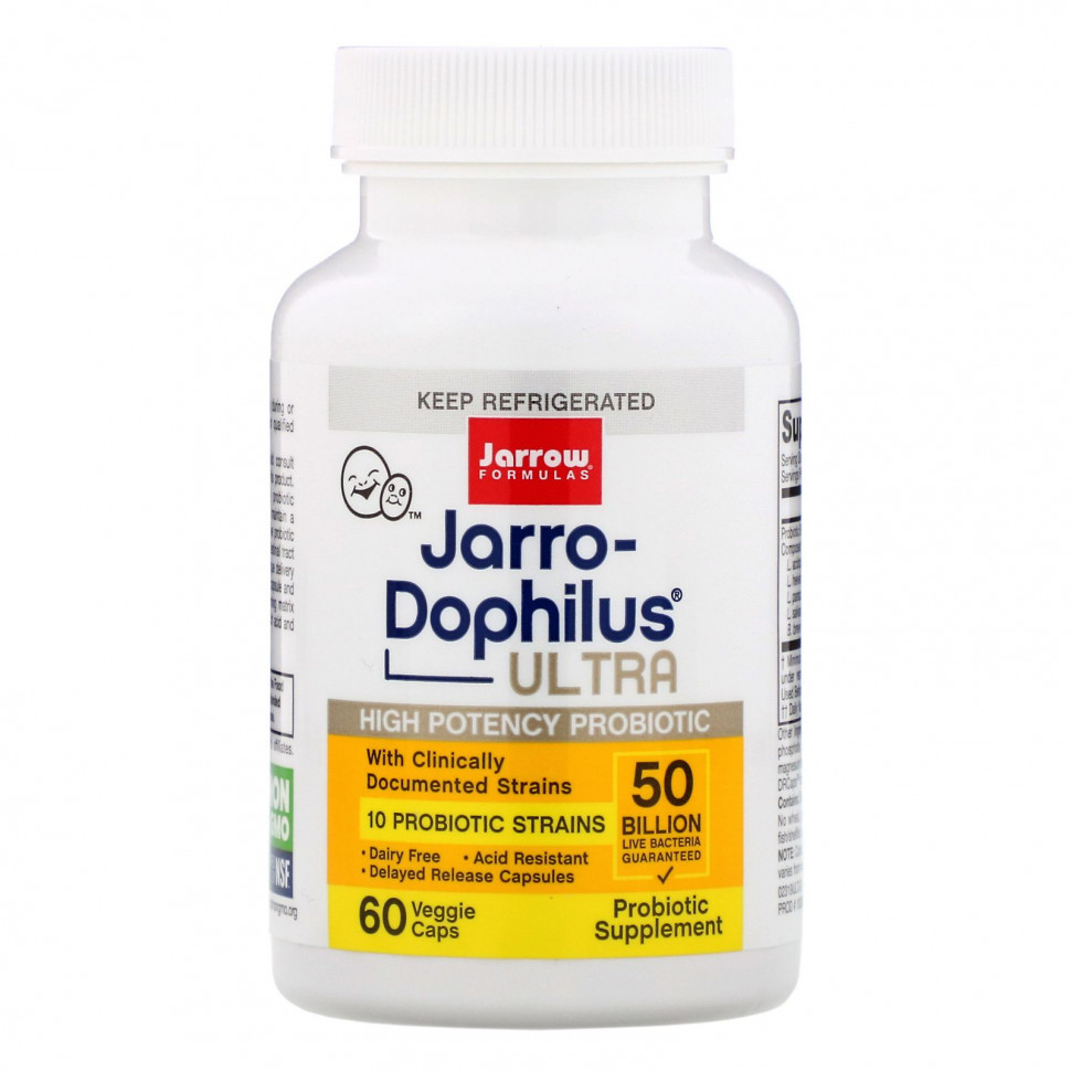 В состав Jarro-Dophilus® Ultra входят клинически подтвержденные штаммы Lactobacilli и Bifidobacterium. Было показано, что B. longum BB536 и B. breve BR-03 повышают уровень полезных бифидобактерий и снижают уровни нежелательных бактерий в кишечнике и поддерживают регулярность. Было показано, что L. acidophilus LA-14 и L. paracasei LPC-37 поддерживают специфические иммунные ответы.