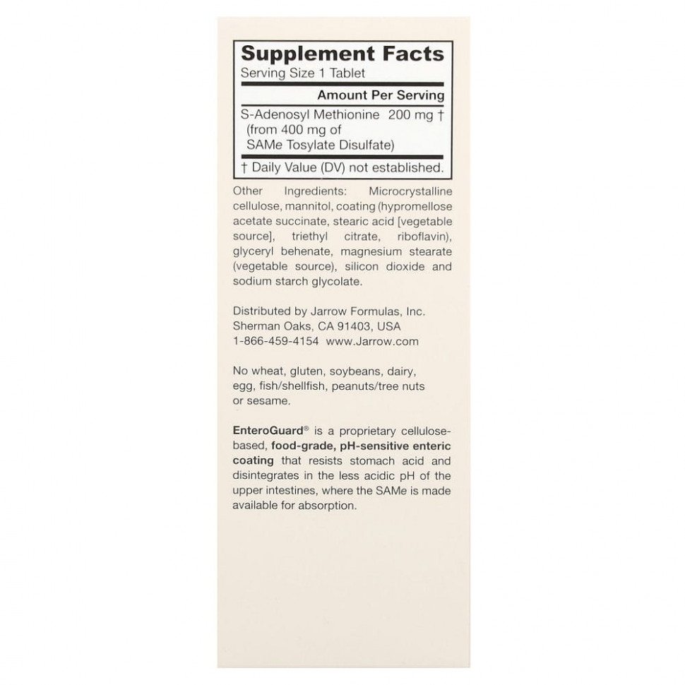 SAM-e 200 от Jarrow Formulas обеспечивает 200 мг SAM-e (чистый выход) из 400 мг тозилатдисульфата SAM-e. SAM-e 200 производится при низкой температуре и низкой влажности и имеет кишечнорастворимое покрытие для обеспечения биологически активного продукта.