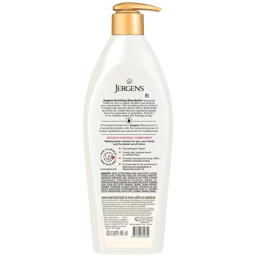 JERGENS OIL-INFUSED ENRICHING SHEA BUTTER 24-HOUR MOISTURIZER Moisturizer melts into skin to deeply condition and enhance your natural sheen. This nourishing lotion & oil blend is infused with naturally derived African Shea Butter and Shea Oil, trusted ingredients. Smooth it on for instantly radiant skin that lasts all day. Oil infused formulas from Jergens Skincare lock in long-lasting hydration with the moisturizing power of trusted ingredients and natural oils for nourished skin. Moisturizer melts into skin to deeply condition and enhance your natural sheen. This nourishing lotion & oil blend is infused with naturally derived African Shea Butter and Shea Oil, trusted ingredients. Smooth it on for instantly radiant skin that lasts all day.