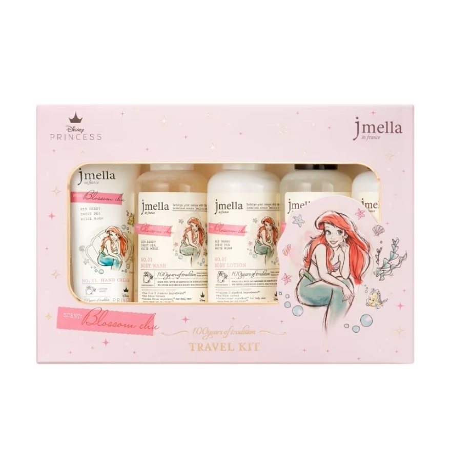 JMELLA IN FRANCE DISNEY BLOSSOM CHU PRINCESS SET A sophisticated floral and sweet berry scent that reminds the characteristic of princess Aerial; cute, sweet, love adventure and excitement This set include: Jmella in france Disney Blossom Chu Body Wash 100ml Jmella in france Disney Blossom Chu Hair Shampoo 100ml Jmella in france Disney Blossom Chu Body Lotion 100ml Jmella in france Disney Blossom Chu Hair Treatment 100ml Jmella in france Disney Blossom Chu Hand Cream 50ml — Dermatologically Tested — Free from 12 chemical ingredients — Mild acidic Formula — contains Patent ingredient for Body Care (Adenium Obeseum Leaf Cell Extract) MADE IN KOREA"