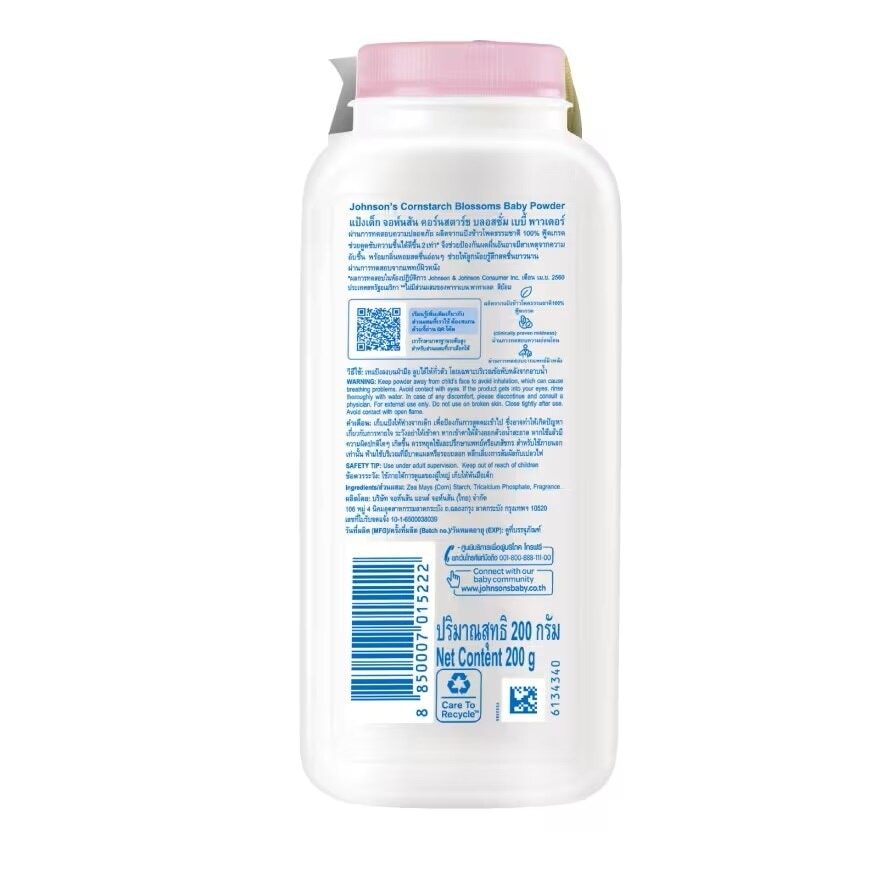 Johnson’s Baby Powder Cornstarch Blossoms Absorbs moisture 2 times better for skin dry and comfort with long-lasting fresh floral scent plus to reduce the chance of skin sensitivity. Made from 100% natural cornstarch with mild floral aroma 0% harmful ingredients Tested by dermatologist. Laboratory test results, Johnson & Johnson Consumer Inc. April 2017, USA. How to use Shake powder onto your hand before applying to babys skin. Close tightly after use. Caution Use under adult supervision. Keep out of reach of children. Warning Keep powder away from children to prevent inhalation, this can cause breathing problems. Be careful not to get it in your eyes. If it gets into your eyes, rinse with clean water. If any abnormalities occur after use, discontinue use and consult a doctor or pharmacist. For external use only. Do not use on cuts or abrasions. Avoid contact with open flames.