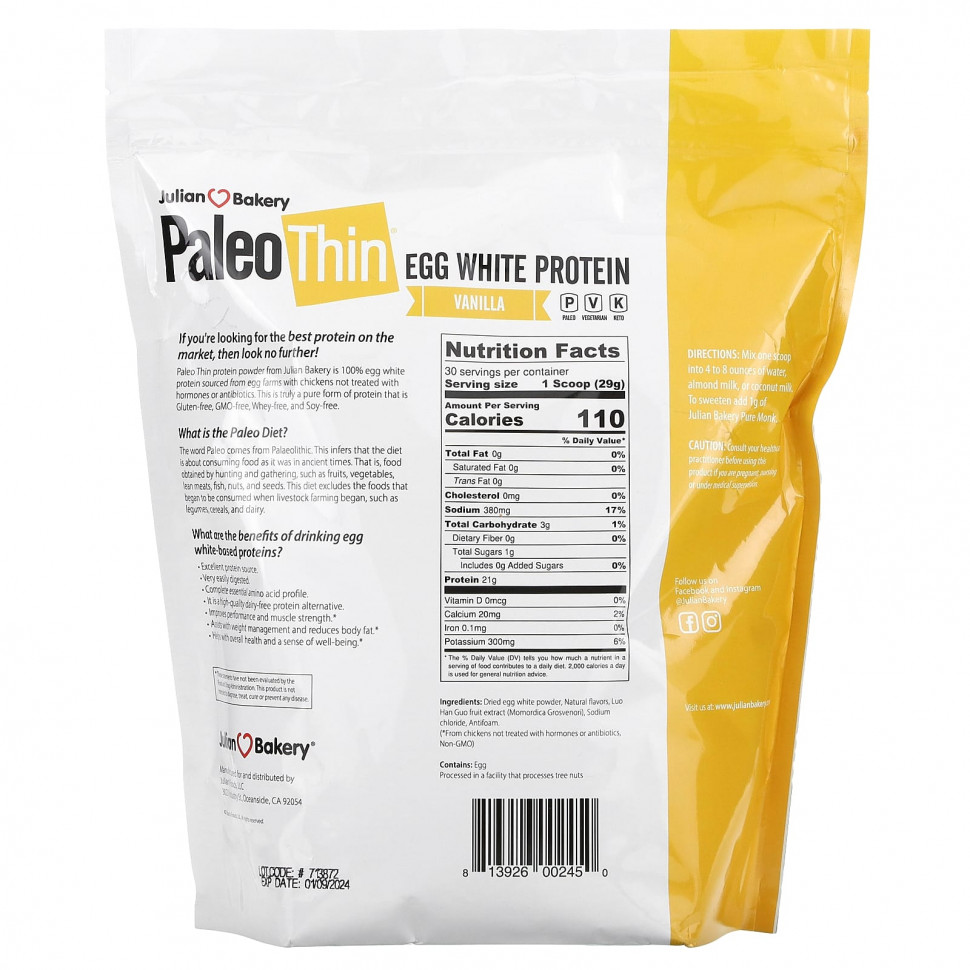 Протеиновый порошок Paleo Thin от Julian Bakery — это 100% яичный белок, полученный на яичных фермах, где кур не обрабатывают гормонами или антибиотиками. Это действительно чистая форма протеина, не содержащая глютена, ГМО, сыворотки и сои.