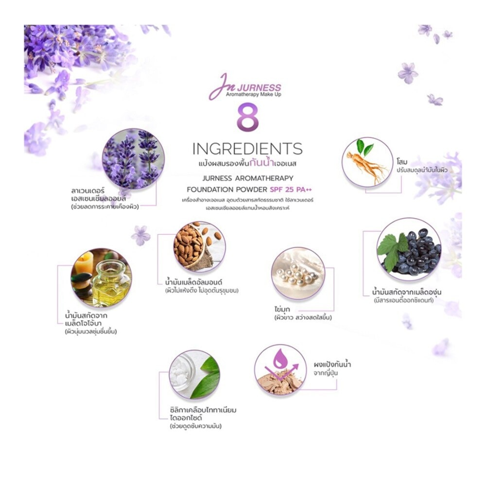 JURNESS Aromatherapy Foundation Powder SPF 25 PA ++ — Water resistant — treated powder pigment from Japan. — Lavender Essential Oil Aroma Sensed — Manufacture Standard : GMP, 14000, 22716, Halal. — Net Weight 12 g. — Dematologically tested. — 6 NO : No Animal Ingredient, No, Fragrance, No Paraben, No Alcohol, No SLS, No SLES. — Water & Sebum Resistant. — Medium Coverage. — Oil Control : Skin never become dull as Titanium Dioxide Encapsulated Silica helps to absorb the oil all day long. — Anti-Wrinkle : Enriched with natural ingredients ,Ginseng, Grape seed oil, Sweet almond oil, etc. No Skin irritation : Substitute synthetic fragrance by natural lavender essential oil. — Brightening : Skin become lighter as the light reflection effect of pearl pigment.