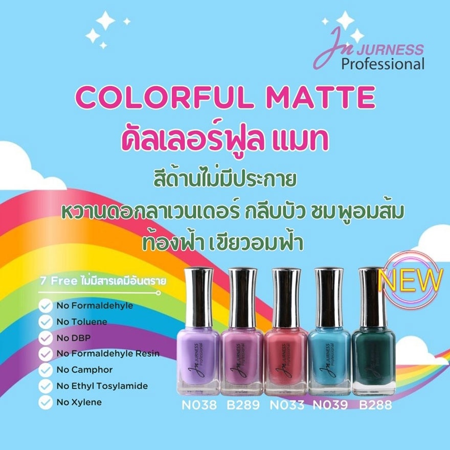 JURNESS Professional Colorful Matte Nail Polish Easy application with smoothness Fast Drying Glossy finish without shimmer Natural color shade Raw Material from France 13 Free No Formaldehyde No Toluene No Formaldehyde Resin No Camphor No No Xylene No Parabens No Phthalates No Rosin No Ethyl No Tosylamide No TPHP (Triphenyl Phosphate) No Triclosan No Animal ingredients No animal derivatives Cruelty free animal testing Apply nail polish on the nails and leave for 1-2 seconds to dry Please do not inhale Keep away from flame or heat