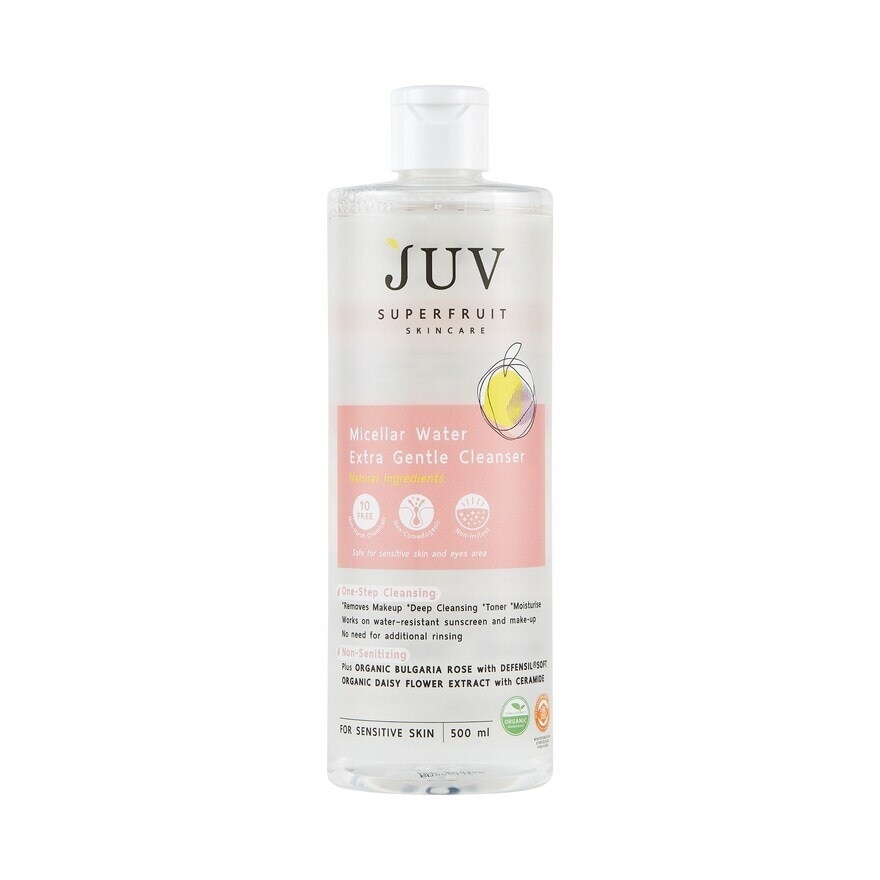 JUV Micellar Water Extra Gentle Cleanser Drops JUV Micellar water on cotton pad. Then sweep on the Face and wipe off. Aqua Water, Decyl Glucoside, Glycerin, Pentylene Glycol, Propanediol, Sorbitan Oleate Decylglucoside Crosspolymer, Phenoxyethanol, Chlorphenesin, Trisodium Ethylenediamine Disuccinate, Lactic Acid, Citric Acid, Butylene Glycol, Aloe Barbadensis Leaf Extract, Glycine Soja Soy bean Germ Extract, Rosa Damascena Flower Water, Albatrellus Ovinus Extract, Citrus Junos Yuzu Seed Extract, Hippophae Rhamnoides Seaberry Fruit Extract, Litchi Chinensis Litchi Seed Extract, Fragaria Ananassa Strawberry Seed Extract, Actinidia Chinensis Kiwi Seed Extract, Brassica Oleracea Italica Broccoli Extract, Bellis Perennis Daisy Flower Extract Certified Organic Ingredients Safe for sensitive skin and eyes area One Step Cleansing Removes Makeup Deep Cleansing Toner Moisturise Works on water Resistant sunscreen and make up No need for additional rinsingRe Perfect to clean the face with Poly Suga Mulse D9 Decyl glucoside 2 Natural surfactant Anti Acne amp; Irritant DEFENSIL SOFT amp; KIWI Extract Anti Ageing Anti-Pollution PM 2.5 SEA BUCKTHOR amp; Super fruit For Sensitive Skin.