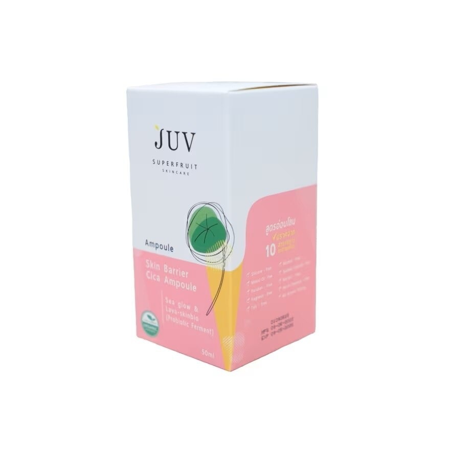 JUV Skin Barrier Cica Ampoule + Sea Glow Lava-Skinbio It soothes and helps restore, acne problems, reviving energy to tired skin and EPS Sea glow that helps to achieve natural rosy skin tone. Lava-Dermabiotics. Apply to facial and neck skin twice daily, morning and evening. Water, Isopentyldiol, Glycerin, Centella Asiatica Extract, Glyceryl Acrylate/Acrylic Acid Copolymer, Propylene Glycol, Caprylhydroxamic Acid, 1,2-Hexanediol, Propanediol, Saccharide Isomerate, Lactobacillus Ferment Lysate, Vaccinium Macrocarpon Fruit Extract, Rubus Idaeus Fruit Extract, Fragaria Ananassa Fruit Extract, PVM/MA Copolymer, Ammonium Acryloyl Dimethyltaurate/Carboxyethyl Acrylate Crosspolymer, Citric Acid, Sodium Benzoate.Madagascar Centella Ampoule is packed with pure Centella Asiatica extract from Madagascar. It soothes and helps restoring acne problems, reviving energy to tired skin with and EPS Sea glow that helps to achieve natural rosy skin tone. Lava-Dermabiotics (Probiotic Ferment) strengthens the skin barrier for healthy skin complexion. Infused with 3 organic superfruits including cranberry, raspberry and strawberry extracts for brighter and whiter skintone.