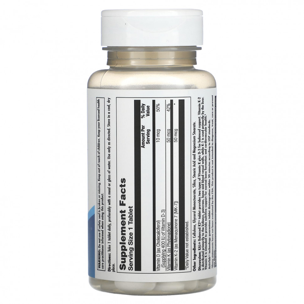 Discussion: KAL® Balanced K2™ provides two types of Vitamin K plus D-3 for balanced support. Vitamin K2 is distributed primarily to the kidney, pancreas, bone and blood vessel walls, while K1 is used primarily by the liver. Vitamin K is intended to provide nutritive support for normal bone formation and cardiovascular health.