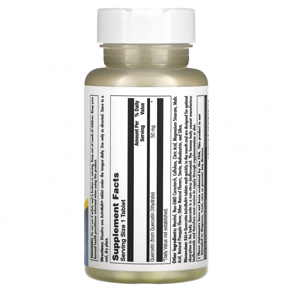 Таблетки KAL® Quercetin ActivMelt® быстро тают во рту и оптимально усваиваются организмом. кверцетин — это не цитрусовый биофлавоноид. Человеческий организм не может производить биофлавоноиды, поэтому он должен получать их с пищей.