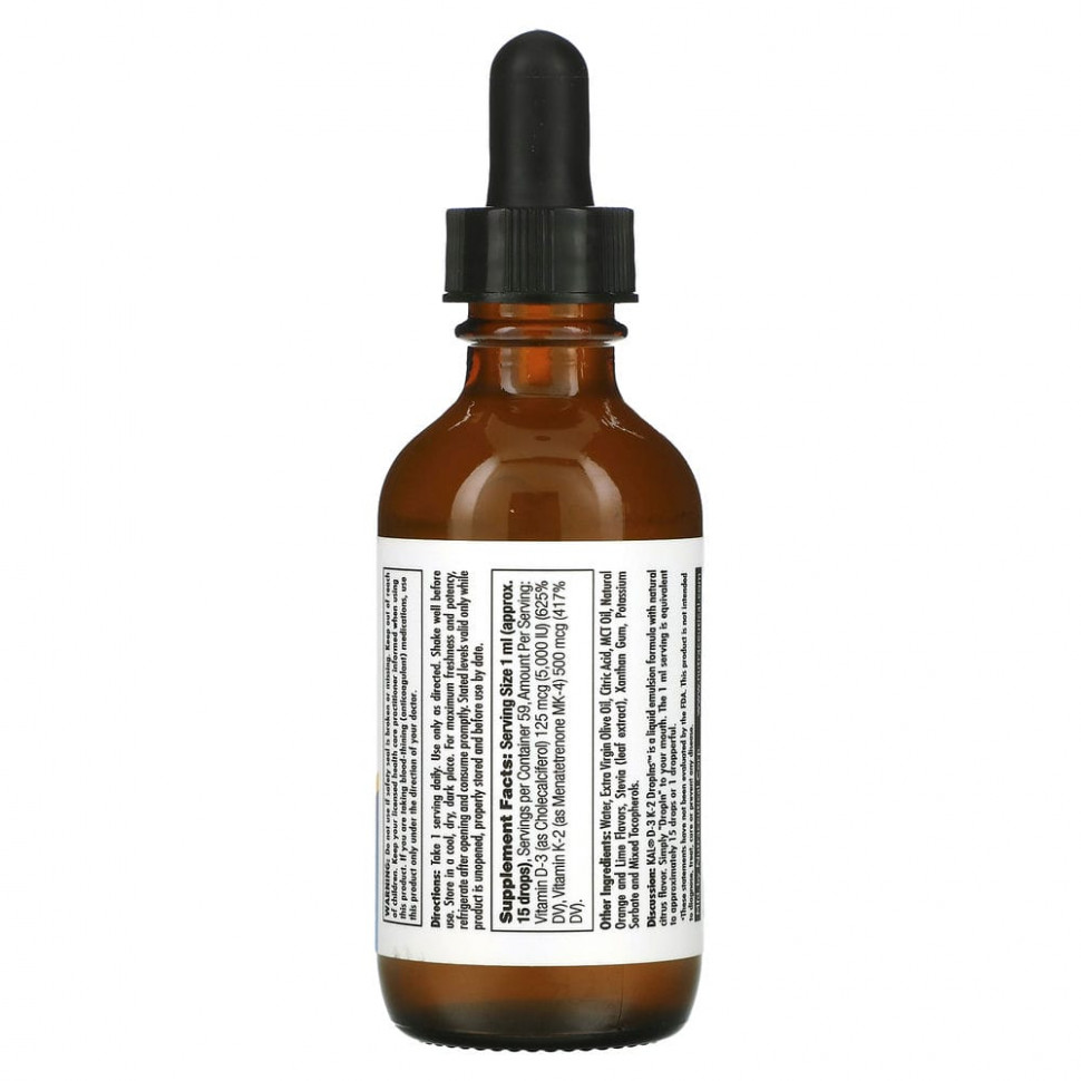 Описание. Витамины D3 и K2 от KAL DropIns — это жидкая эмульсия с натуральным цитрусовым вкусом. Просто ‘капли в рот. Размер порции составляет 1 мл, что приблизительно равняется 15 каплям или 1 полной мерной пипетке.