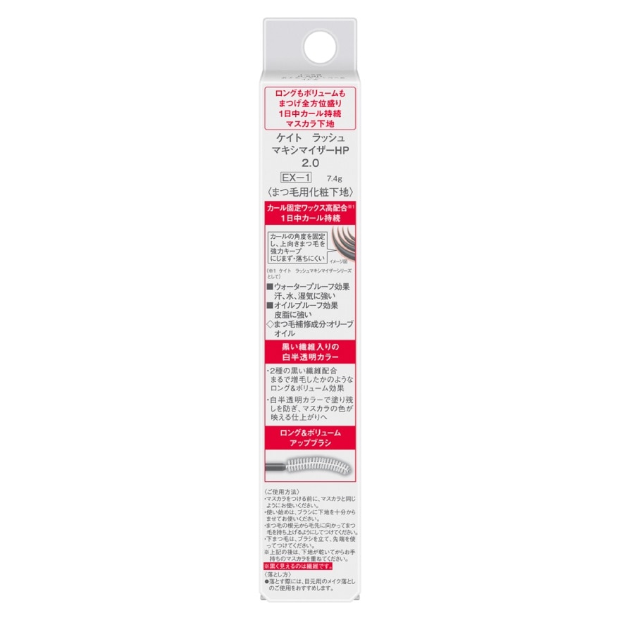 Kate Lash Maximizer Hp2.0 Ex-1 7.4 G Keep Your Eyelash Makeup Beautiful All Day Long. Sustains Curls Lengthens And Volumizes. A Mascara Primer That Achieves The Finish You Desire. Product Features. Waterproof Formula Resistant To Sweat Water And Humidity. Oilproof Formula Resistant To Sebum. Sustains Curls All Day Long. Contains Black Fibers. Contains Eyelash-Repairing Ingredient (Olive Oil). Contains The Largest Amount Of Curl Fixing Wax In The Series. Fix The Angle Of Curls And Persistently Keep Eyelashes Curving Upward. Does Not Smudge And Stay Put. Changed The Two Kinds Of Black Fibers To Microplastic-Free Fibers For Natural Effects As If You Increased The Number Of Eyelashes.