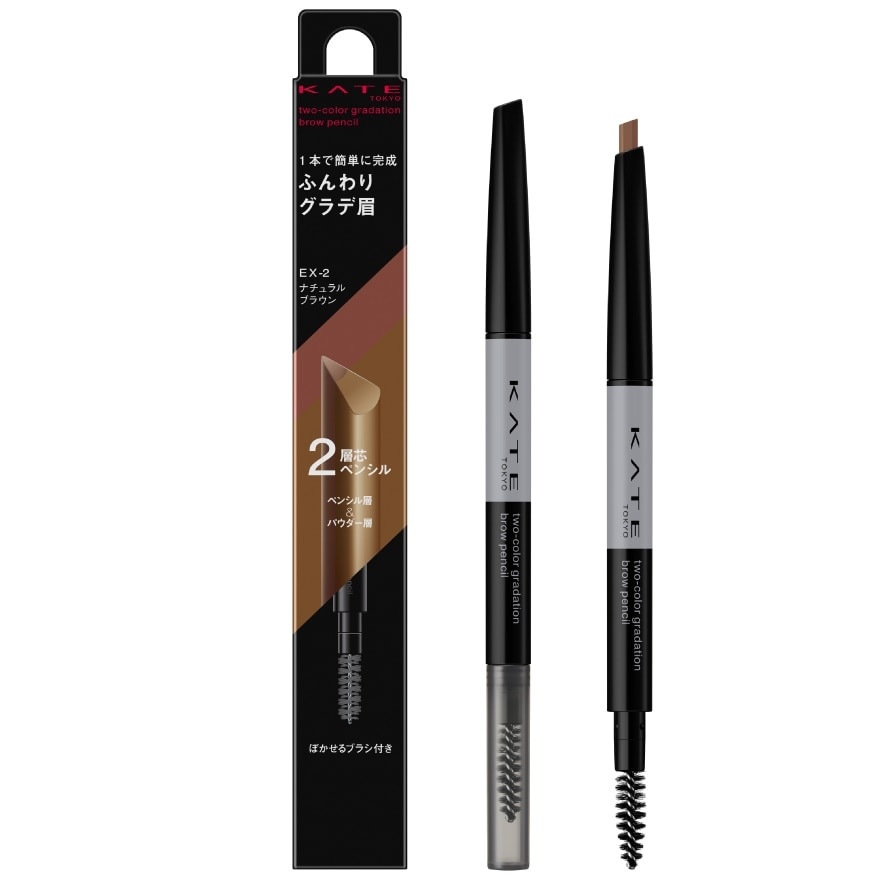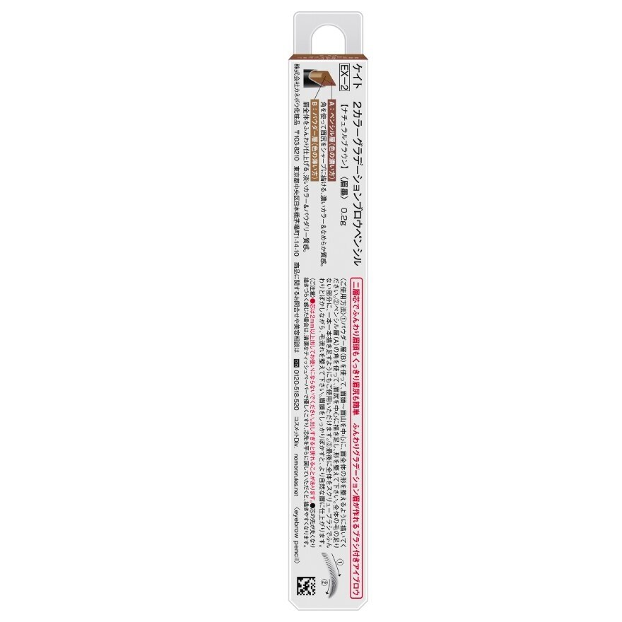 KATE TWO-COLOR GRADATION BROW PENCIL EX2 (Natural Brown) 0.2 g. A triangular x double-layer pencil. Sharp Layer The perfect width and darkness suitable for the outer end. Powdery Layer Fluffy texture and soft coloration, suitable for the inner end to the peak of the arch. With a screw brush Give extra contours by softly blurring with a moderately soft brush. An eyebrow pencil with a brush that comprises two layers. Powdery Layer and Sharp Layer, to easily complete beautiful eyebrows. The triangular double-layer core allows you to create gradation eyebrows. Powderly Layer for a fluffy look Gives the entire eyebrow a fluffy look with a lighter color and powdery texture. Sharp Layer for an outlined look Uses the edge to sharply outline the outer end of the eyebrow with a darker color and smooth texture.