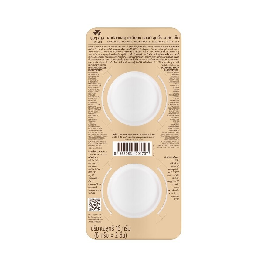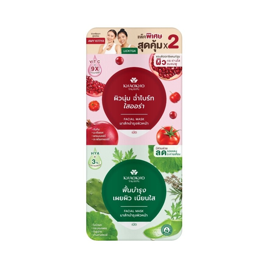 Khaokho Talapu Radiance & Soothing Mask Radiance Mask is enriched with high anti-oxidants from pomegranate, combined with Lycopene from tomatoes and cranberries up to 9 times helps the skin look smooth and radiance. It also contains Hyaluronate, Niacinamide, and Pentavitin to increase the efficiency of moisturizing and reduce irritation. To expose your healthy skin. Soothing Mask is enriched with natural Cica, Mugwort and Aloe Vera to soothen and strengthen your skin barrier, reduce inflammation and balance the skin. Combined with Cactus extravct and Hyaluronate effectively moisture your skin. It also contains Niacinamide and Pentavitin to increase the efficiency of moisturizing and reduce irritation. Rejuvenate the skin to be healthier. Radiance Mask 1. Mask texture, light, concentrated 2. Select ingredients from various red plants. 3.LycoMega from Tomatoes and Cranberries with 9 times the concentration of natural lycopene 4.Vitamin C and high antioxidants from pomegranate and acerola cherry 5. Help fill the brightness. reduce dark spots soothing mask products 1. Mask texture, light, concentrated 2. Select ingredients from various green plants. Centella asiatica, ginseng, and aloe vera that has the ability to strengthen the skin’s protective barrier Help reduce inflammation of the skin. 3.AquaCactus from Cactus Locks moisture, full of water for the skin. 4.Hyaluron adds moisture under the skin layer. 5. Niacinamide reduce blood spots Make your skin smooth and gentle.