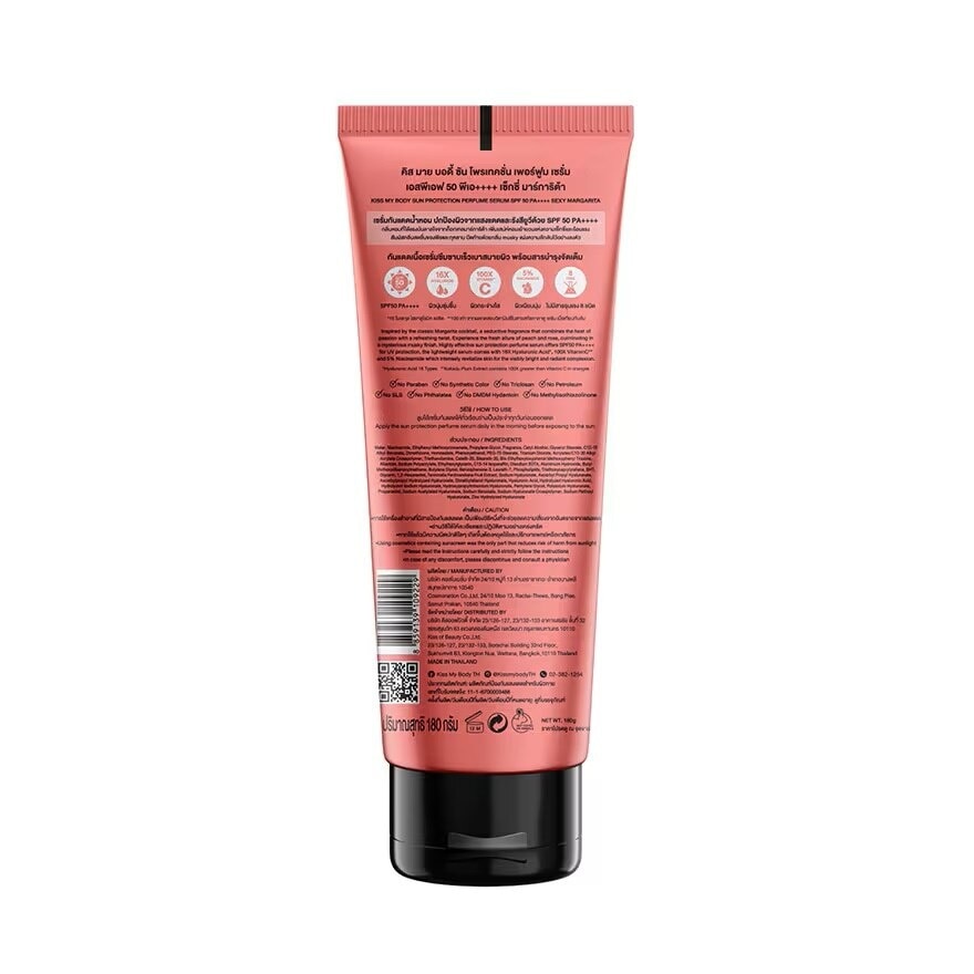 Inspired by the classic Margarita cocktail, a seductive fragrance that combines the heat of passion with a refreshing twist. Experience the fresh allure of peach and rose, culminating in a mysterious musky finish — Highly effective sun protection perfume serum offers SPF50 PA++++ for UV protection, the lightweight serum comes with 16X Hyaluronic Acid , 100X Vitamin C and 5% Niacinamide which intensely revitalize skin for the visibly bright and radiant complexion. — No Paraben, Synthetic Color, Tricloson & SLS — Hyaluronic Acid 16 Types — Kakadu Plum Extract contains 100X greater than Vitamin C in oranges.