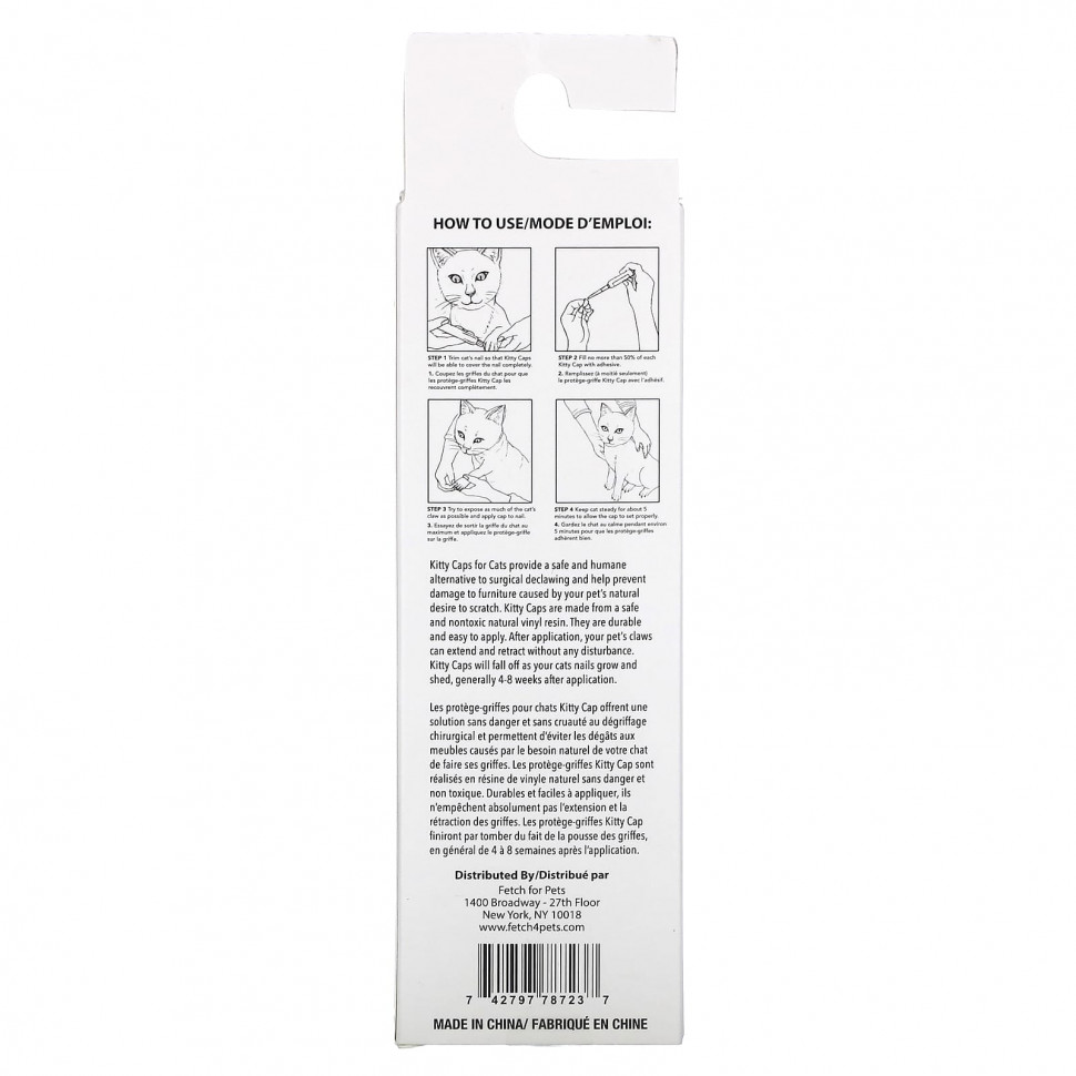 Кепки для кошек являются безопасной и гуманной альтернативой хирургическому удалению когтей и помогают предотвратить повреждение мебели, вызванное естественным желанием вашего питомца почесаться. Kitty Caps изготовлены из безопасной и нетоксичной натуральной виниловой смолы. Они прочные и легко наносятся. После нанесения когти вашего питомца могут выдвигаться и втягиваться без каких-либо проблем. Kitty Caps будет падать по мере роста или выпадения когтей, обычно через 4–8 недель после нанесения.
