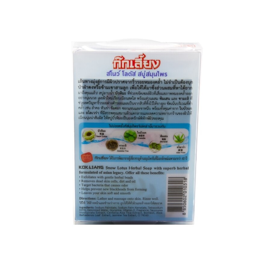 Kokliang Snow Lotus Herbal Soap with superb herbal formulated of asian legacy. Offer all these benefits: • Exfoliates with gentle herbal beads • Removes dead skin cells, dirt and oil • Target bacteria that causes odor • Helps prevent new blackheads from forming • Leaves your skin soft and smooth
