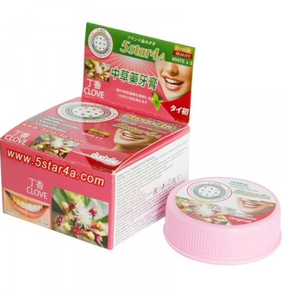 Знаменитая тайская отбеливающая зубная паста на травах «5 звезд 4 А» с ярким травяным вкусом с преобладанием гвоздики — это концентрированная зубная паста в круглой баночке на основе натуральных компонентов с эфирными маслами и с отличным антибактериальным компонентом в виде экстракта гвоздики.