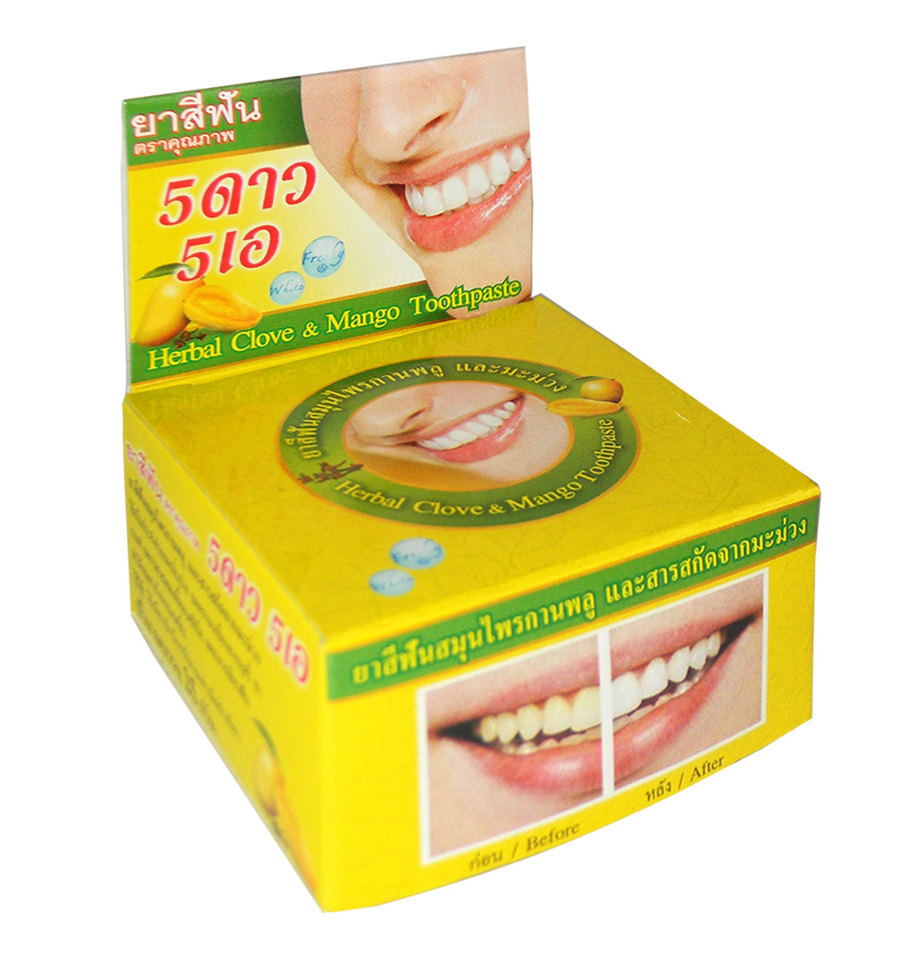 Одна из таких паст – тайская зубная паста с манго и борнеолом и отбеливающим эффектом, размещенная в таре, имеющей форму круглой коробочки.