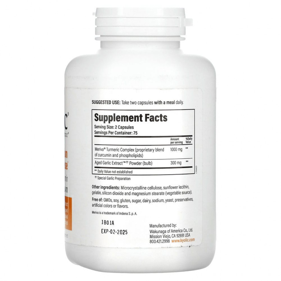 Куркумин Kyolic® — это синергетическая комбинация комплекса куркумы Meriva® и выдержанного экстракта чеснока ™ без запаха из 100% органически выращенного чеснока из Калифорнии, обеспечивающего питательную поддержку для здоровой реакции на воспаление.