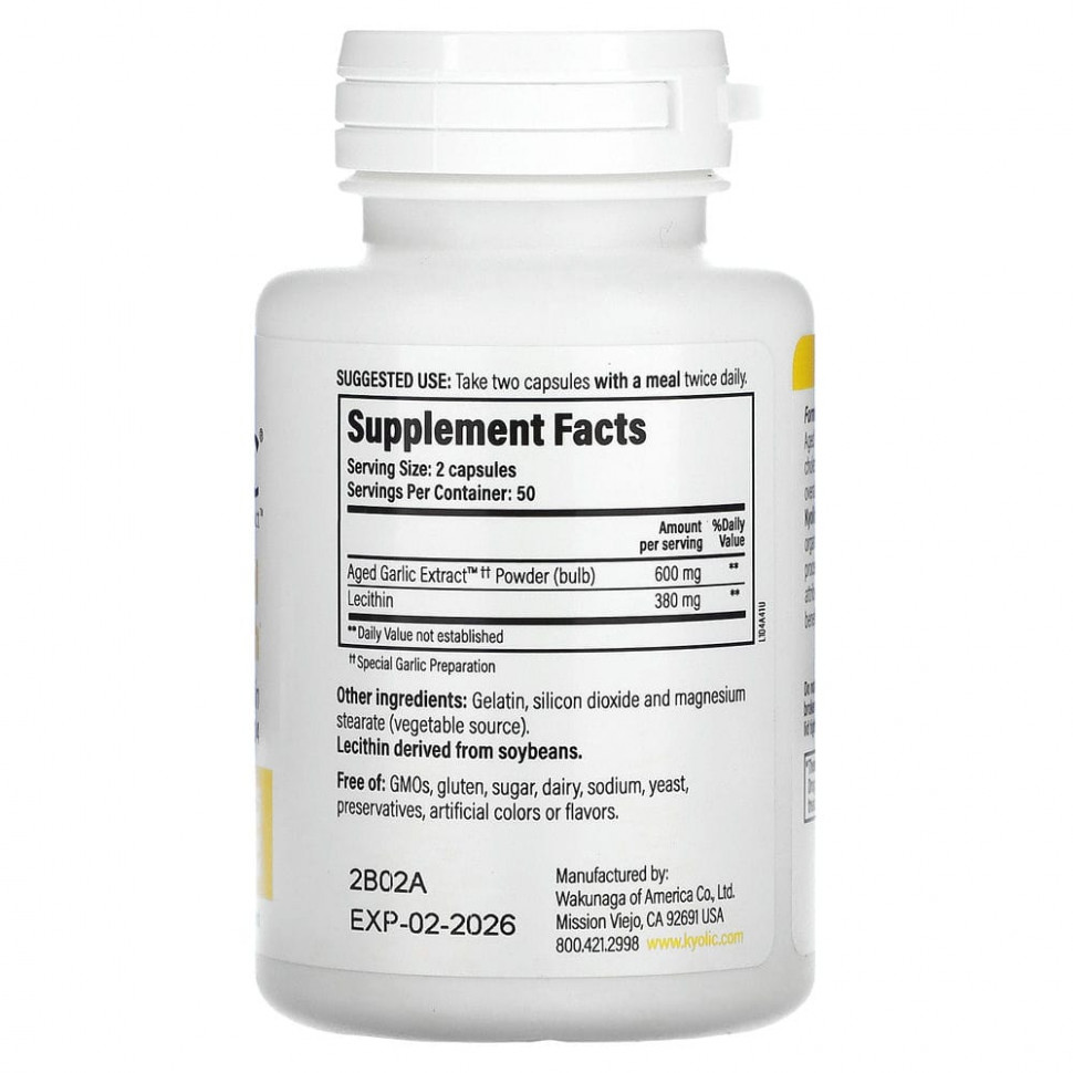 Добавка Aged Garlic Extract™ от Kyolic® содержит 100% луковиц органического чеснока, выращенного в Калифорнии. Использование уникальной технологии извлечения экстракта из выдержанного особым образом чеснока позволяет получить продукт, обогащенный полезными соединениями, но без характерного запаха. Такой способ применяется только в Kyolic. Сочетание лецитина и экстракта чеснока Aged Garlic Extract помогает сохранять в пределах нормы уровень холестерина у здоровых людей и поддерживает здоровье сердечно-сосудистой системы.