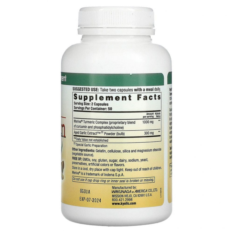 В состав куркумина от Kyolic® входит взаимно усиливающая комбинация комплекса Meriva®с куркумой и экстракта на 100% органического, выращенного в Калифорнии чеснока без запаха от Aged Garlic Extract™. Такой состав обеспечивает питательную поддержку нормальной воспалительной реакции организма.