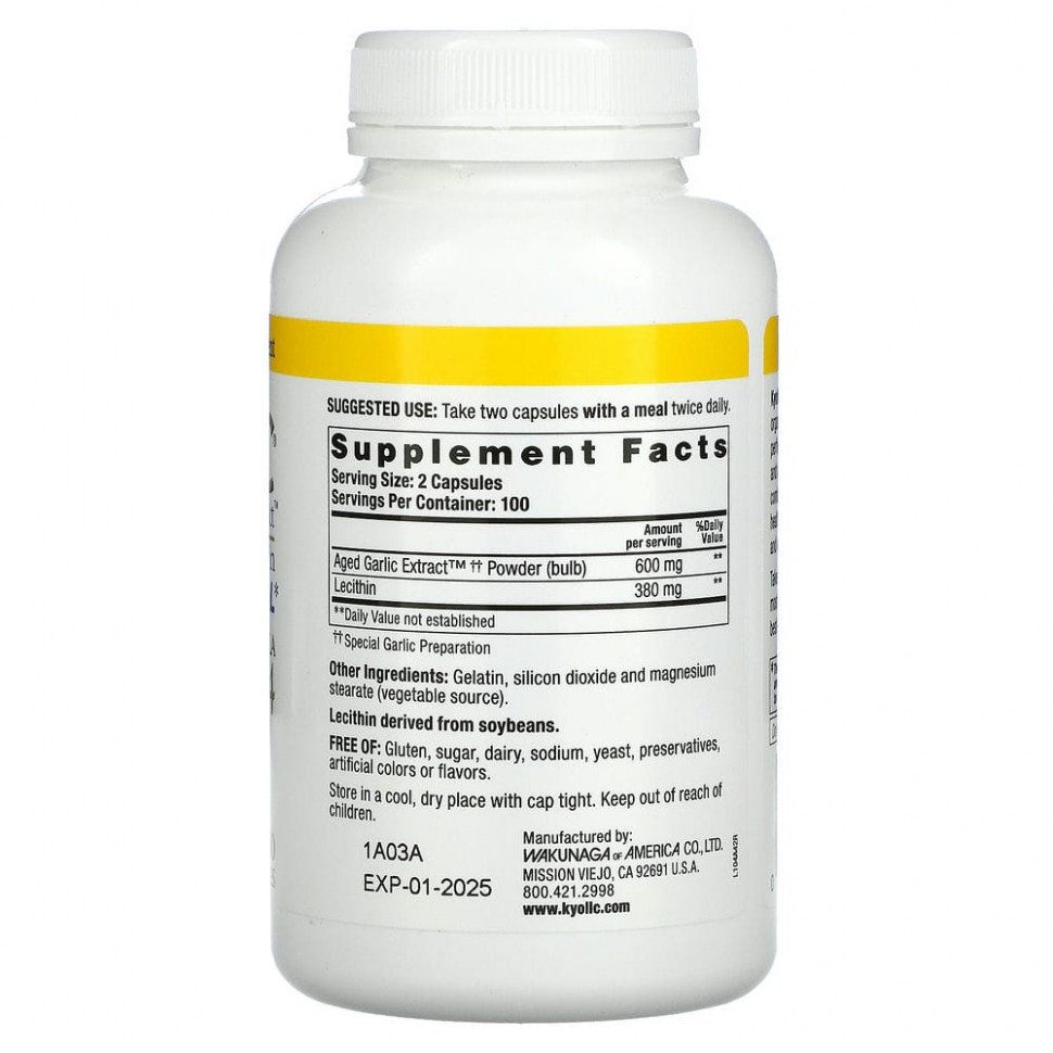 Экстракт чеснока Aged Garlic Extract™ от Kyolic® изготовлен из 100% органического чеснока, выращенного в Калифорнии. Использование уникальной технологии извлечения экстракта из выдержанного особым образом чеснока позволяет получить продукт, обогащенный полезными соединениями, но без характерного запаха. Такой способ применяется только в Kyolic. Сочетание лецитина и экстракта чеснока Aged Garlic Extract помогает сохранять в пределах нормы уровень холестерина у здоровых людей и поддерживает здоровье сердечно-сосудистой системы.