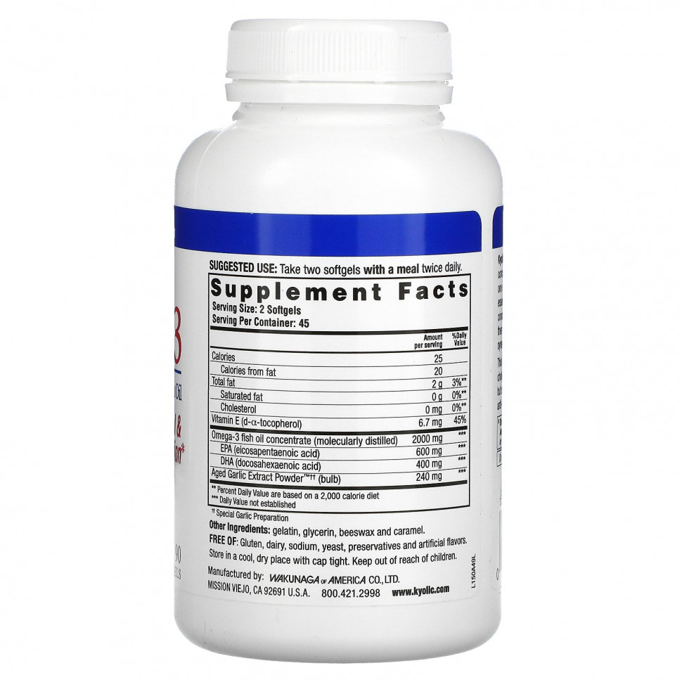 Добавка с омега-3 от Kyolic® — это очищенный на молекулярном уровне концентрат рыбьего жира, прошедший проверку на чистоту и эффективность, который содержит высокую концентрацию экологически чистых важнейших омега-3 жирных кислот ЭПК и ДГК. Источником этого суперчищенного и концентрированного рыбьего жира является рыба из холодных первозданных вод. Полученный жир соединяют с выдержанным экстрактом чеснока без запаха, чтобы эти два компонента взаимно усиливали друг друг в организме.