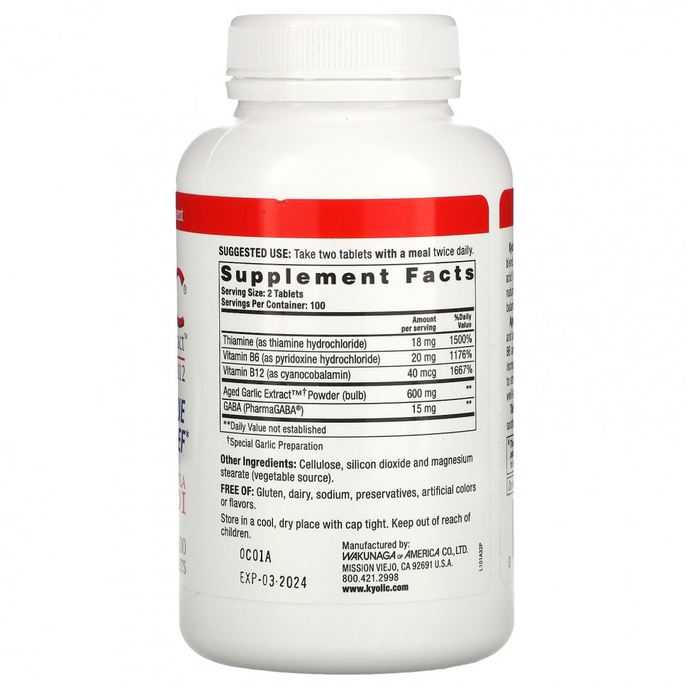 Формула Kyolic 101 против усталости и стресса представляет собой уникальную смесь экстракта чеснока, гамма-аминомасляной кислоты (ГАМК) и витаминов B1, B6 и B12, предназначенной для естественного удержания психического, эмоционального и физического равновесия в нашем, все более беспокойном мире.