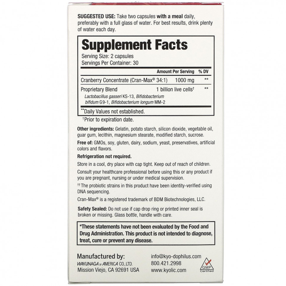 Kyo-Dophilus® Cran + Probiotic содержит 1000 мг экстракта клюквы Cran-Max® и три биосовместимых пробиотика человеческого штамма Friendly Trio®. Cran-Max производится из 100% сухих веществ плодов клюквы с использованием процесса, в котором концентрируются натуральные преимущества цельной клюквы, без использования каких-либо растворителей, консервантов, сахара, воды, ароматизаторов или красителей.