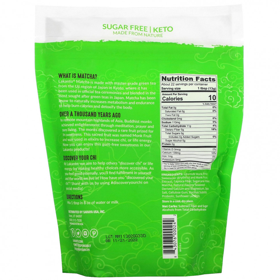 Матча Lakanto® производится из зеленого чая высшего сорта из региона Удзи в Киото, Япония, где он использовался на официальных чайных церемониях и смешивался с самыми популярными зелеными чаями в Японии. Матча, как известно, естественным образом повышает метаболизм и выносливость, помогает сжигать калории и выводить токсины из организма.
