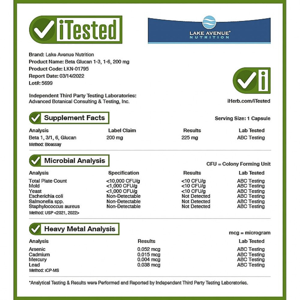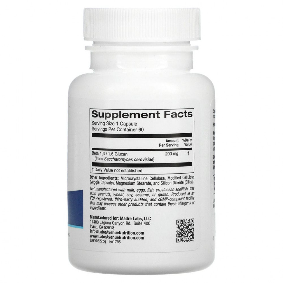 Бета-глюкан Lake Avenue Nutrition содержит бета-глюканы, полученные из пекарских дрожжей (Saccharomyces cerevisiae). Добавка не содержит глютена, ГМО и сои, а также подходит для вегетарианцев.