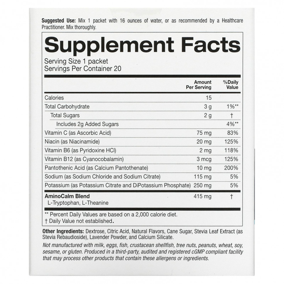 Смесь для приготовления успокаивающего напитка Calm от Lake Avenue Nutrition содержит комбинацию успокаивающих аминокислот и других питательных веществ в виде порошка. Благодаря пакетикам с отмеренными дозами готовить успокаивающий напиток удобно как дома, так и в путешествии.