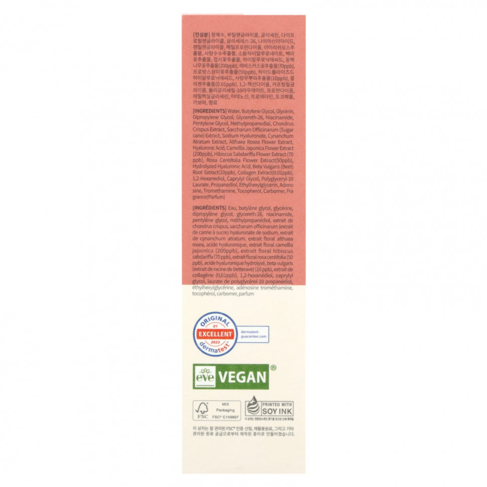 Вода, бутиленгликоль, глицерин, дипропиленгликоль, глицерет-26, никотинамид, пентилен гликоль, метилпропандиол, экстракт ирландского мха (Chondrus crispus), экстракт сахарного тростника (Saccharum officinarum), гиалуронат натрия, экстракт цинанхума (Cynanchum atratum), экстракт цветков штокрозы розовой (Althaea rosea), гиалуроновая кислота, экстракт цветков камелии японской (200 част. / млрд), экстракт цветков гибискуса (Hibiscus sabdariffa) (70 част. / млрд), экстракт цветков розовой (Rosa centifolia) (50 част. / млрд), гидролизованная гиалуроновая кислота, экстракт корня свеклы (Beta vulgaris) (10 част. / млрд), экстракт коллагена (0,01 част. / млрд), 1,2-гександиол, каприлилгликоль, полиглицерил-10 лаурат, пропандиол, этилгексилглицерин, адено-синус, трометамин, токоферол, карбомер, отдушка.